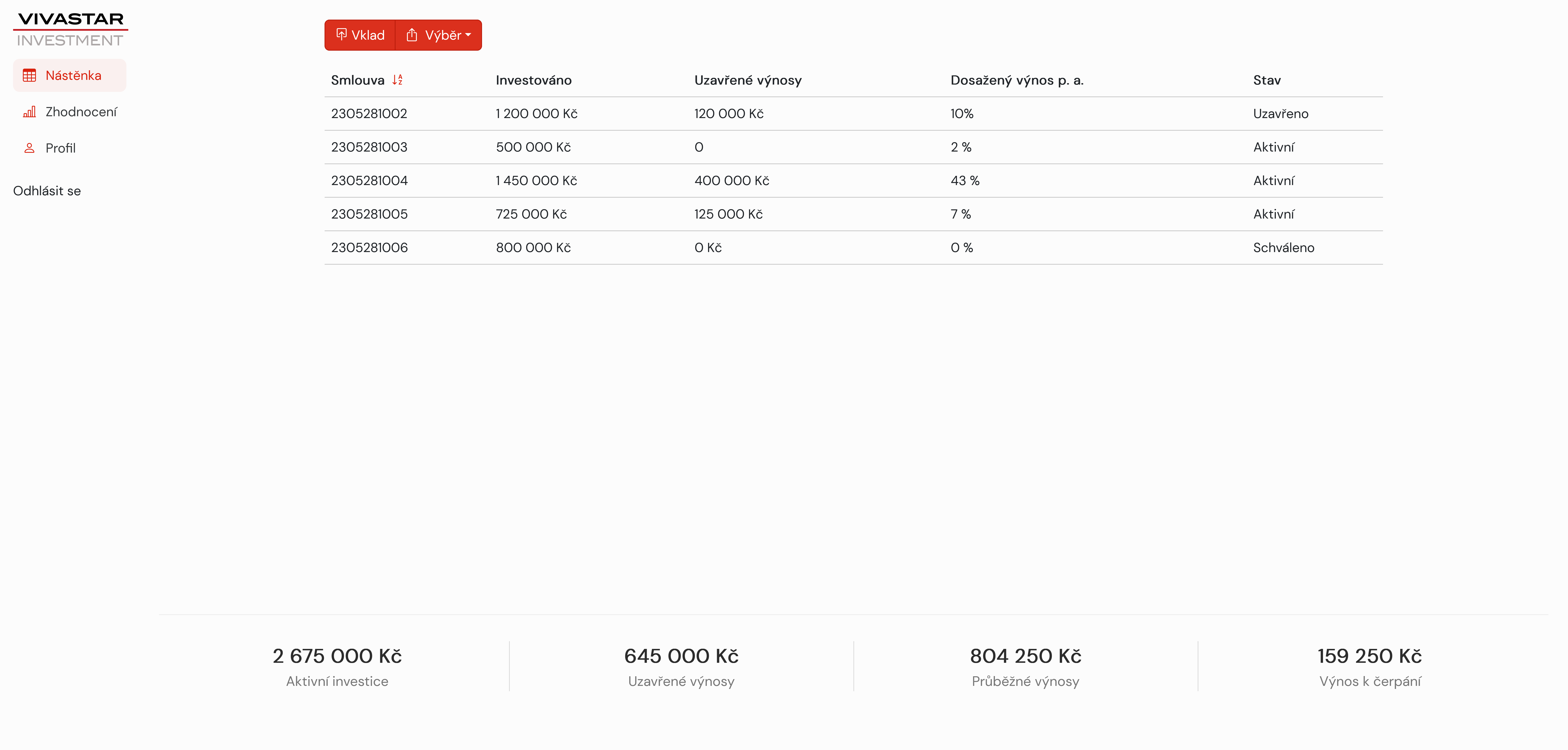 Portál pro klienty a administrátory podílového fondu. Klienti (fyzické osoby, OSVČ i firmy) se mohou registrovat, vyplní potřebné údaje včetně AML dotazníku, investičního dotazníku a volitelně také prohlášení kvalifikovaného investora a podepíší dynamicky generovanou PDF smlouvu.
